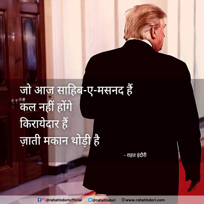 Rahat Indori (1 January 1950 – 11 August 2020) was an Indian Bollywood lyricist and Urdu poet. He was also a former professor of Urdu language and a painter. Prior to this he was a pedagogic of Urdu literature at Devi Ahilya University, Indore. (Wikipedia). He passed away on August 11, 2020. He had achieved a PhD in Urdu after obtaining an MA in the same language. He has left behind a legacy of beautiful and powerful poetry that continues to inspire and resonate with people even today.